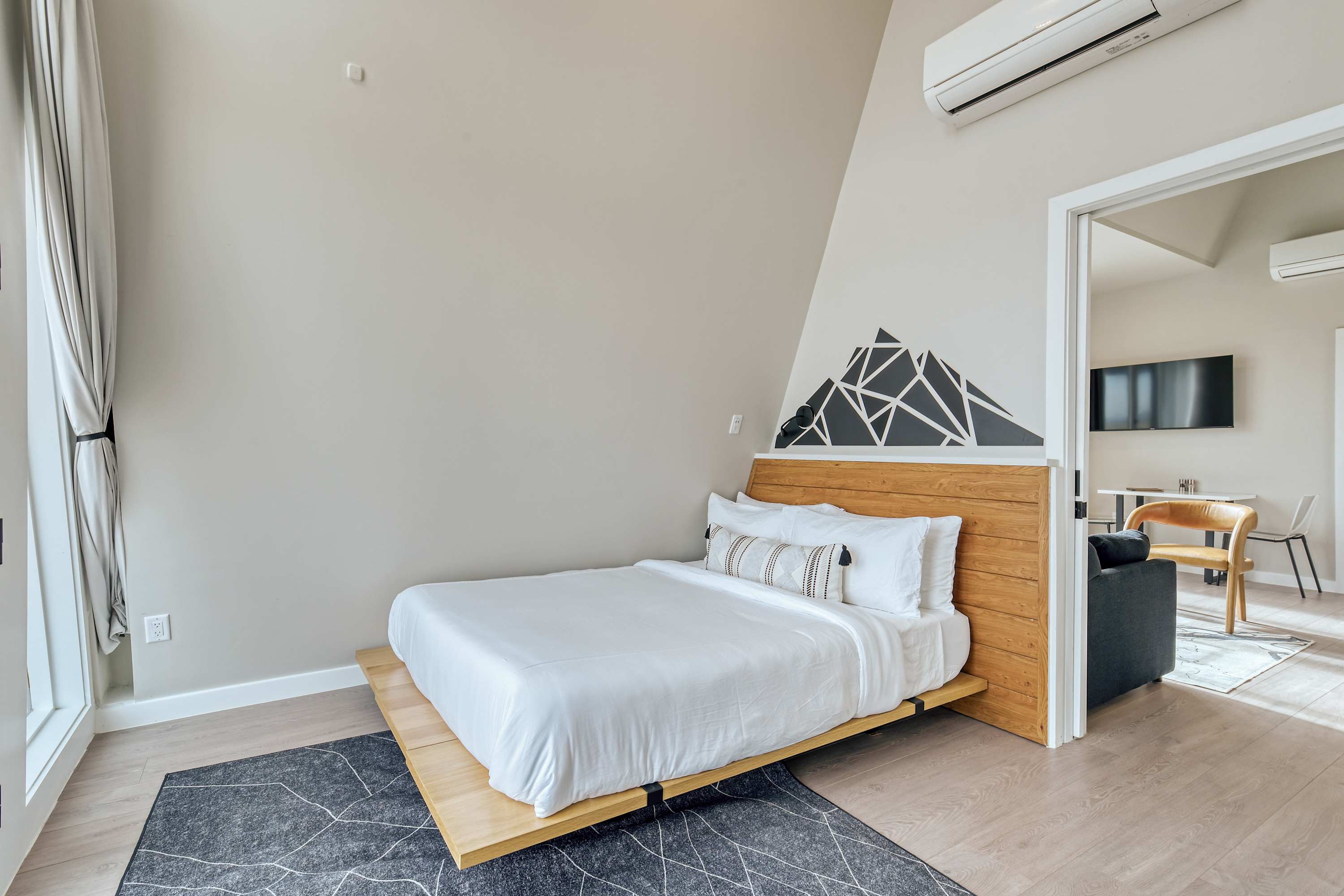 The living room has a very comfortable sleeper sofa from West Elm that converts into a queen bed. There is a coffee table with some books, trail maps, etc. Opposite to that, we have two armchairs. There is a smart TV mounted on the wall, with all your favorite apps like Netflix, Hulu, Disney, ESPN, etc. There is a small dining table with two chairs in front of the TV. The same table can be used as a workspace for remote work.