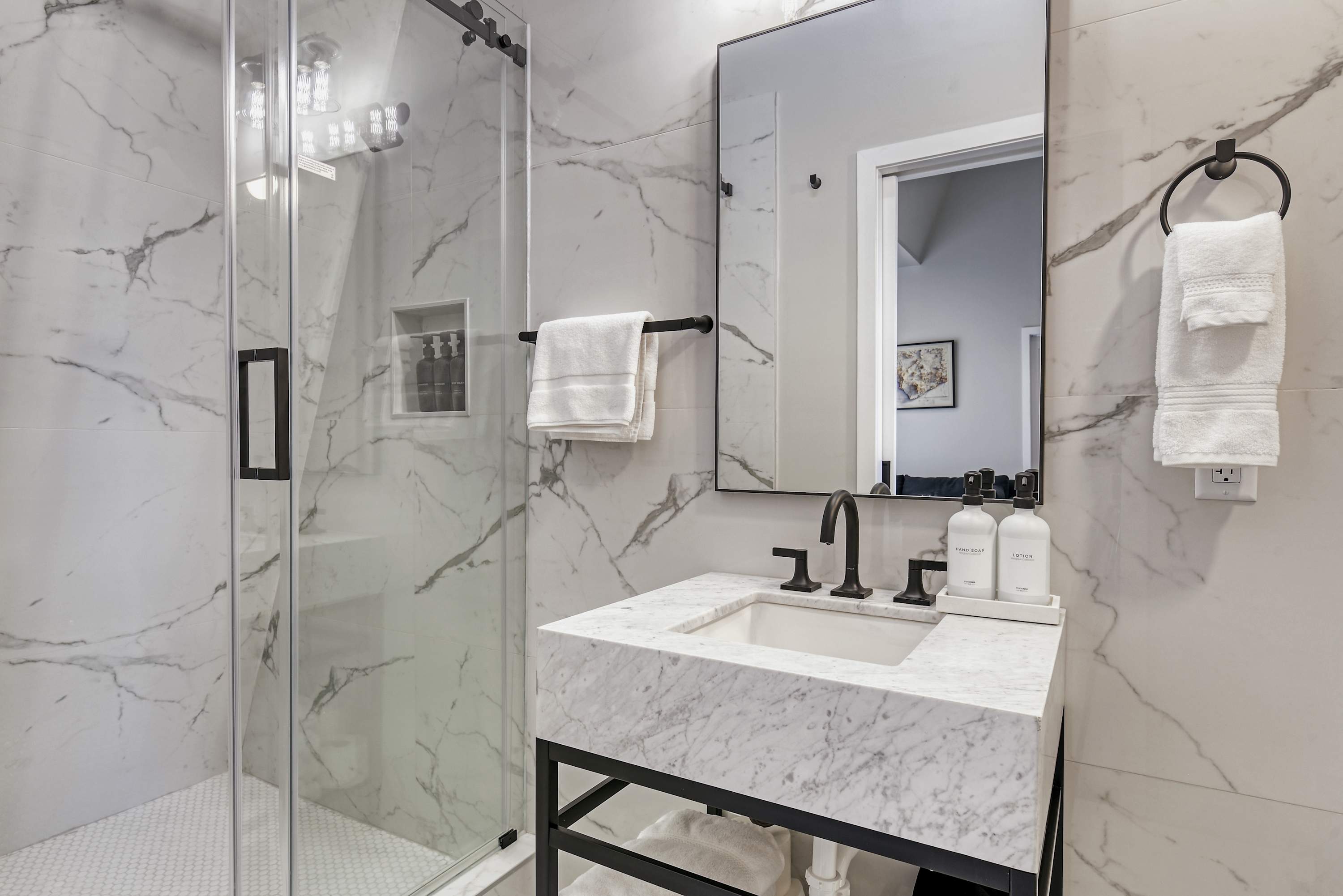 The washroom has a shower, marble vanity, and a wall-mounted toilet. We provide a hair dryer, shampoo, conditioner, body wash, hand soap, and lotion.