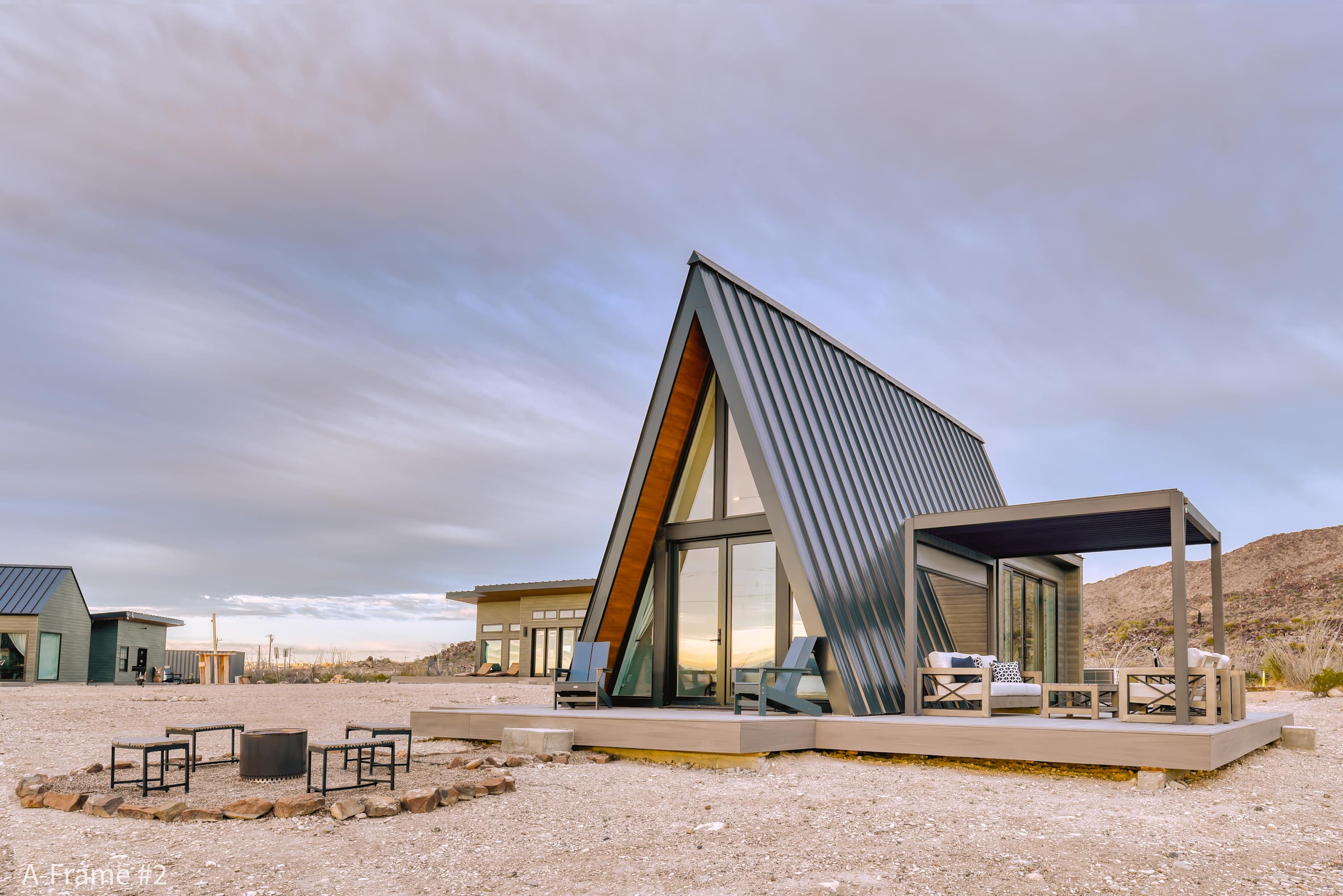 On the outside, we have a hammock and a sofa dining set under a covered pergola. The pergola has louvers that can be opened or closed depending on the weather. It also has a screen that can be pulled down for shade. In front of the A-Frame, we have two Adirondack chairs that you can sit in and enjoy the magnificent view of the Chisos mountains. There is also a firepit with four benches around it.